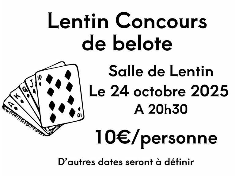 Le Foyer Socio Culturel de Lentin organise un concours de belote le 24 octobre 2025 à la salle de Lentin.