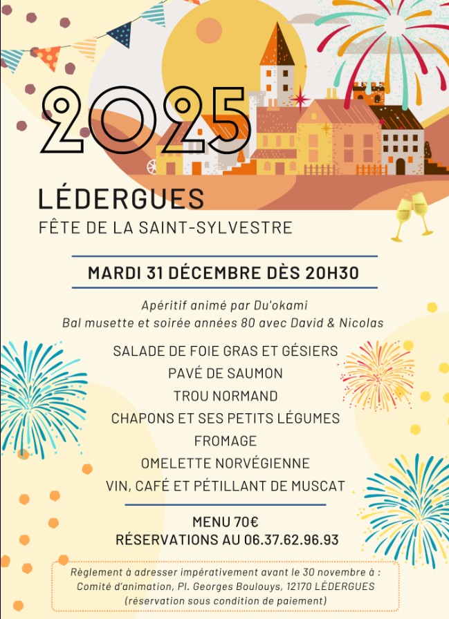 Le Comité d’Animation de Lédergues (CAL) organise un réveillon pour la Saint-Sylvestre à la salle polyvalente de Lédergues. Plus d’information sur l’affiche.