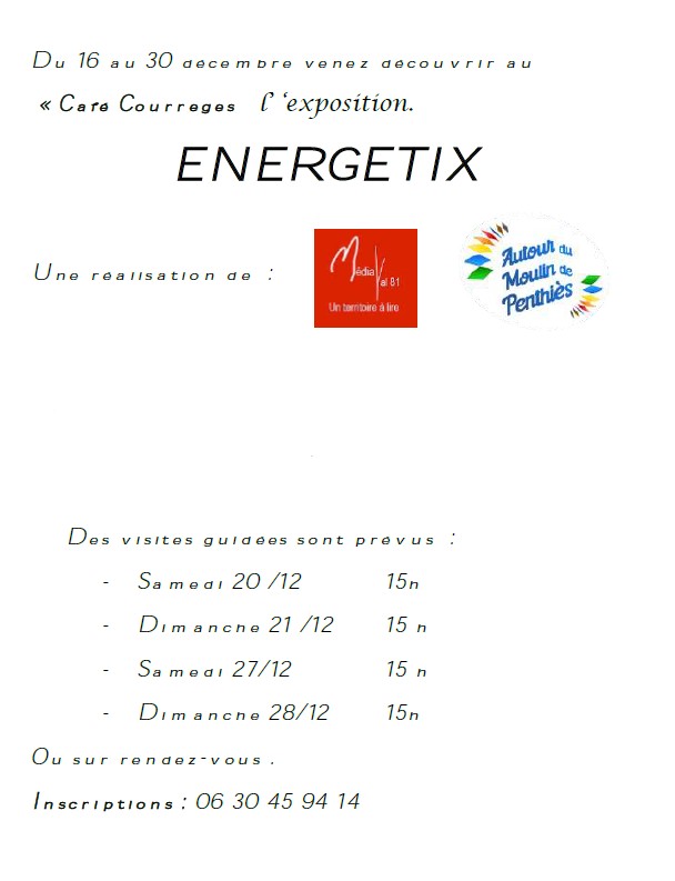 L’association Autour du Moulin de Penthiès vous présentera son exposition « Energétix et l’Homme découvre les énergies » durant la fin du mois de décembre à l’ancien Café Courrèges à Lédergues.
