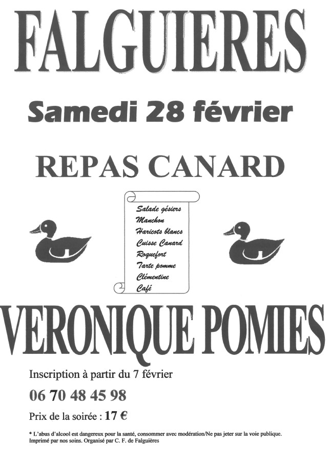 Le comité des fêtes de Falguières organise le samedi 28 février à 20 heures un repas canard animé par l’orchestre Véronique POMIES.